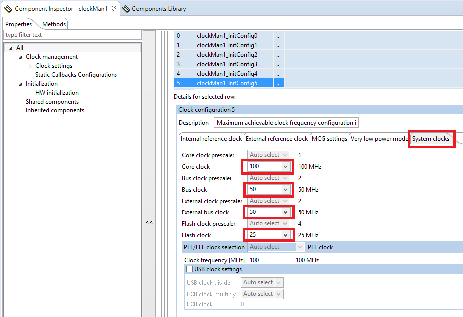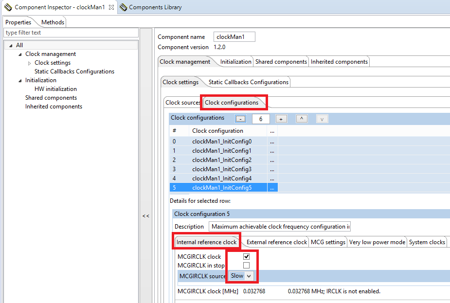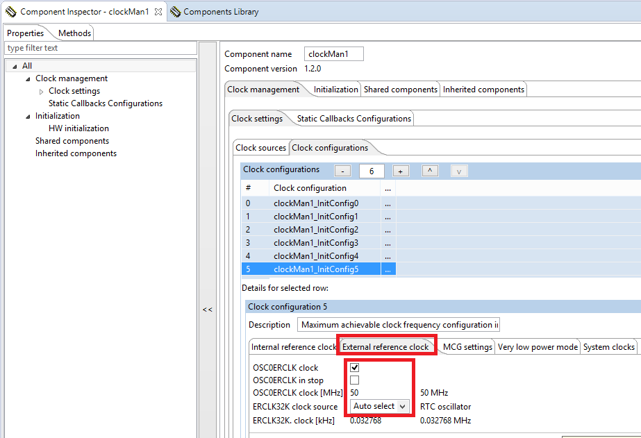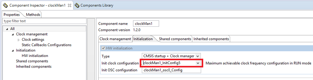 Lets take a look at the clock manager to see what the settings are in this example. Go into the Processor Expert perspective. Select the “clockMan1:fsl_clock_manager” component in the Components window.