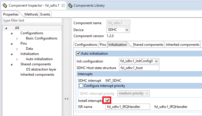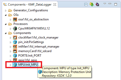 Note: In KSDK 1.2.0 the option to disable the MPU is not available on this component, you will need to manually add the component “Init_MPU” and disable it from there.