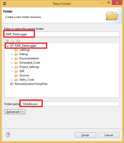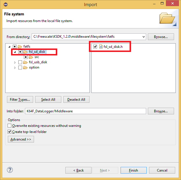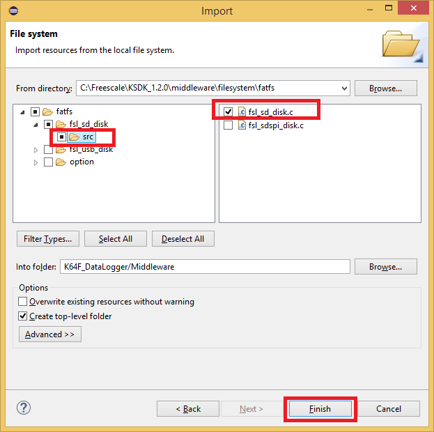 - On the Project Explorer window, expand the folder \SDK\usb\usb_core\device\sources. Create a folder under the sources folder called “classes”.Import the following 3 folders into the classes folder from the path “C:\Freescale\KSDK_1.3.0\usb\usb_core\device\sources\classes”