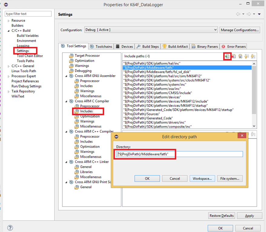 - We need to add these new folders into the includes. Open up the project properties and add the following 4 folders under “C/C++ Build >> Settings >> Cross ARM C Compiler >> Includes”.