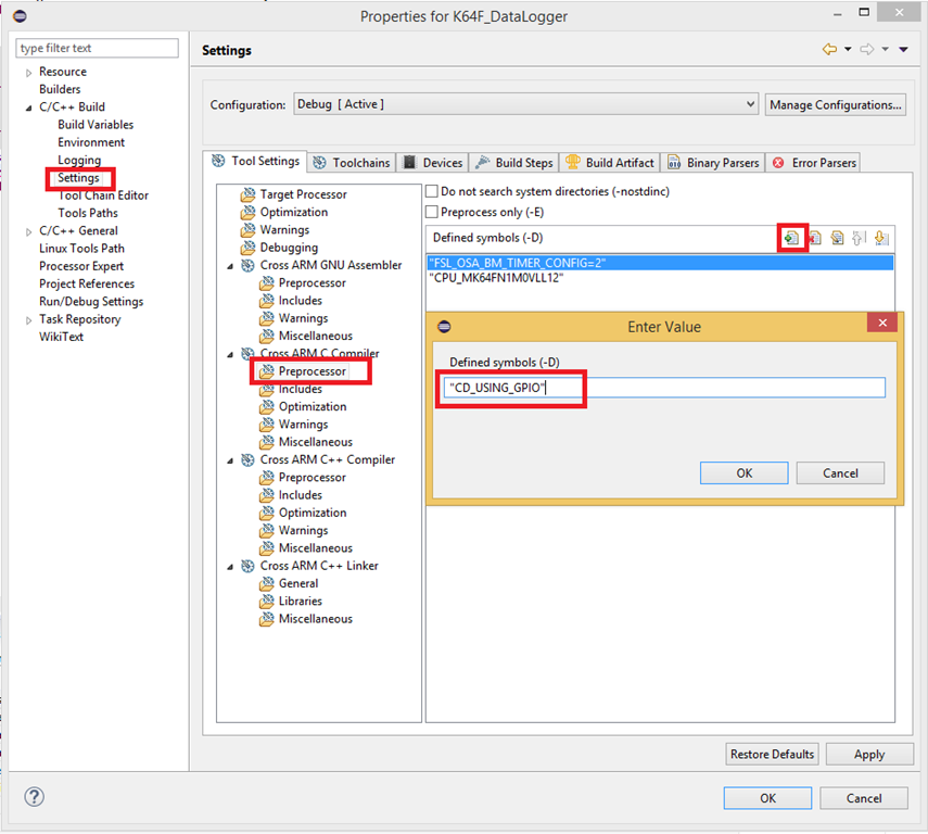 - Open up the Properties of the project and under “C/C++ Build >> Settings >> Cross ARM C Compiler >> Preprocessor” add the symbol “BOARD_USE_VIRTUALCOM”. make sure to include the double quotes around the symbol.